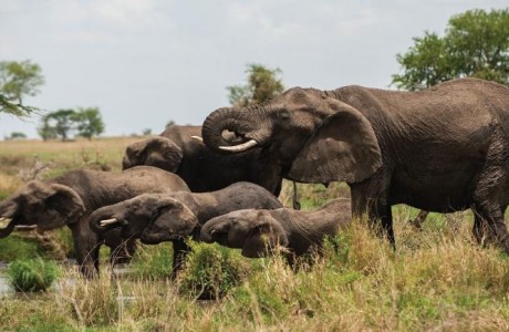 In the wet season, water holes offer plenty of water for these Serengeti elephants.