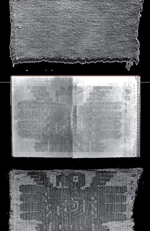 An 8 1/4–inch-wide piece of cloth, top photograph, was excavated at Huaca Prieta, an archaeological site on the north coast of Peru. No motif was immediately evident on the artifact, but detailed documentation of the weaving pattern, middle, revealed the figure of a spread-winged male condor with a snake in its stomach. Bottom: Retouched photograph simulates the original appearance of the fabric.