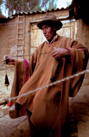 It’s a rare travel article about Peru that does not have a photograph of a woman spinning as she walks, her spindle dangling as it twists the fiber. There is truth in this stereotype, but in some communities males also spin, or females spin and males ply (twist together lengths of spun yarn, also using a spindle). This kind of spinning, called drop spindle, is done with the spindle held vertically. Sheep’s wool (introduced by the Spaniards) or camelid fiber is wrapped around the spinner’s wrist or attached to a distaff, frequently a sturdy stick about a yard long. Because wool and camelid hair have microscopic scales, the fibers hold together as they are twisted. The spinner pulls the fibers from her bundle with her left hand (called drafting), while snapping the spindle with the thumb and fingers of her right hand. Viewed from above, a spindle held vertically whirls clockwise (the most natural direction when using the thumb and fingers), and the yarn that is spun on it has a twist that resembles the slope of the letter Z.