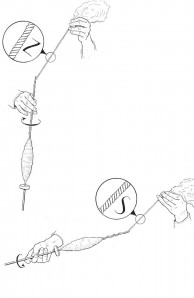 Yarn is spun from fiber using a thin stick (the spindle) weighted with a cylindrical flywheel (the whorl). Using the thumb and fingers to spin a drop spindle (left) results in yarn with a Z-twist, so named because slant of the twist resembles the diagonal of that letter. A spindle held horizontally (below) results in an S-twist, the mirror image of a Z-twist. As yarn is spun, the spinner pauses periodically to wind it around the spindle for storage.