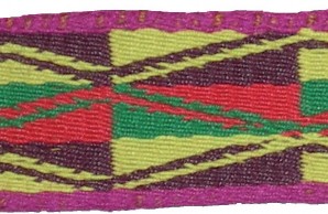 Contemporary sara (maize or corn) belt from San Ignacio de Loyola: The weavers say the four triangles that make up each diamond represent growing tips of corn, while the diamond represents a “seed.” The most common fiber for such belts is commercial acrylic yarn.