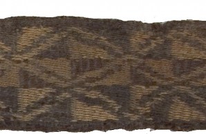 The twelve heddle numbers were a mystery, however. Desrosiers did not think that they referred to twelve distinct heddles, as no known Inca looms with multiple heddles were known to exist. However, the rainy Andean highlands are not conducive to textile preservation; most pre-Hispanic textiles are found on the coast. Subsequently, at the AMNH, Desrosiers found a pre-Hispanic example of a belt with the same motifs, but woven by a slightly different technique. That belt, identified as Inca, had been excavated in Chimbote on the Peruvian coast by Adolph Bandelier in an 1894 expedition sponsored by the museum. It measures 131 inches long by 1 1/2 inches wide and is made from natural-colored camelid yarn in black, light brown, dark brown, and (now somewhat yellowed) white [see photograph below]. After examining this belt, Desrosiers concluded that Murúa’s numbers referred to multiple heddles after all. Evidently by Inca times, weavers had figured out how to semi-mechanize the process of weaving repeated motifs, eliminating the handpicking of each row through the use of multiple heddles. Murúa’s instructions specify how to create a repeated motif composed of four differently colored triangles arranged to form a diamond. Each line of code specifies how to handle all 104 yarns and their duplicates, since when one warp is picked up, its duplicate drops to the other side of the belt, giving a double-faced fabric considered by the Incas to be the most prestigious textile. The four warps and their duplicates on each edge of the belt are not included in Murúa’s picking sequence because they simply form a plain-weave border in a fifth color.