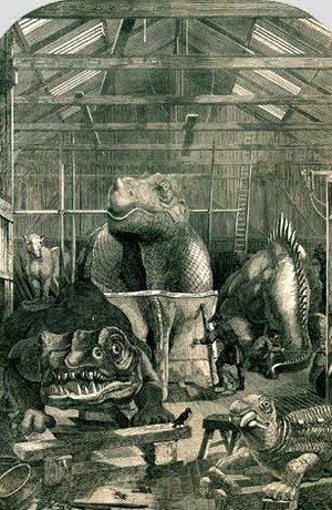 Benjamin Waterhouse Hawkins’s life-size reconstructions of prehistoric animals take shape in 1853, in preparation for their installation on the landscaped grounds of the Crystal Palace in Sydenham, London.