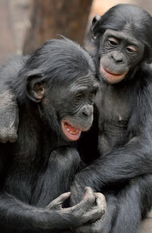 Bonobos are among the most playful primates, and have a special laughing expression, known as the “play face,” exhibited here by the bonobo at left.