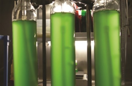Cultures of the cyanobacterium Synechocystis suspended in liquid