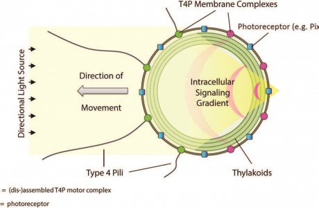 Synechocystis belong to the ancient group of cyanobacteria, found in huge numbers in open water and as slimy biofilms in terrestrial habitats. They are considered to be the first organisms to carry out oxygenic photosynthesis, the production of sugars from carbon dioxide and water using light as an energy source, with oxygen released as a by-product. Sunlight is the main source of energy for Synechocystis, but it can also be harmful, as too much radiation damages the bacteria’s photo-synthetic apparatus. Synechocystis cells therefore seek places with optimal light conditions, a behavior termed phototaxis.