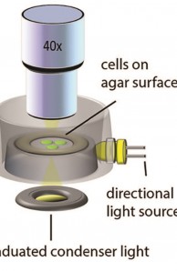 A key observation was that when we used a source directly below the plate to establish a steep light gradient across it, so that one edge of the plate was in darkness and the opposite edge was very bright, the cells moved randomly rather than collecting in an area with optimal light intensity. The cells’ ability to find the light was therefore not guided by sensing changes in light intensity as they moved, but by an accurate perception of the direction of the light source. In this case, since the light source came from below the plate, they could not pull themselves toward it.