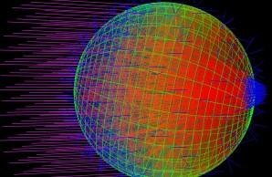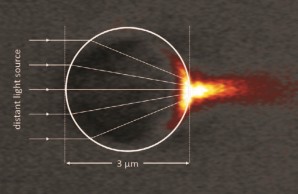 Spherical Synechocystis cells focus incoming light (lines coming from the left) at one point of the cell, opposite to where the light entered.
