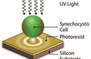 To capture a high-resolution image of the light pattern produced by Synechocystis cells, we turned to a technique commonly used in the production of computer chips. This process, called photolithography, involves first creating a plate with holes or transparencies in the desired pattern, and then shining ultraviolet light through this plate onto a light-sensitive material. Infinitesimally small patterns can be produced on the light-sensitive material. Instead of using a plate with holes, we shone light through single Synechocystis cells and imprinted the near-field light scattering onto the light-sensitive material. Using an atomic force microscope, we measured the surface relief produced by the refracted light beneath and around each cell. The resulting pattern of ridges and valleys was an accurate reproduction of the light field created by interference, refraction, and internal reflection in the bacterial cells. We also found that below the center of each cell, the light was focused to a remarkably sharp spot with a diameter less than the wavelength of the light used to draw it.
