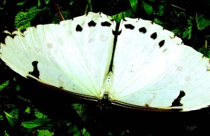 Suddenly I spotted what appeared to be a snow-white bird gliding above the forest canopy. But no, the specter was instead an enormous butterfly. Based on what I remembered reading, this had to be the “white morpho” (Morpho polyphemus)—an unusual member of a group of large tropical butterflies that usually sport metallic blue wings. From my vantage point along the road, I now could see that the butterfly was particularly attracted to the emergents, trees that rose above the canopy. The insect would circle—perhaps searching for its host plant or for a source of nectar or nutritious sap—then move on, flapping its wings with deep, deliberate strokes. I stood there, hoping that when it crossed the road it would descend to ground level.