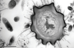 Cross-section of a hover fly larva cuticle, showing nanopillars extending from the surface