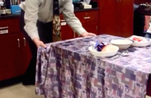 Participants watched a video of an expert performing a tablecloth trick (removing the tablecloth from a set table) before rating their own abilities to do the same trick.