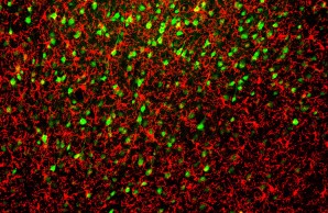 Mouse brain neurons (green) and inflammatory cells (red). Blocking CCR5 gene expression reduces the intensity of the latter.