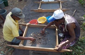 Two local workers sieve sediments to retrieve archaeological materials at the site of Mahilaka, a tenth- to thirteenth-century trading port at the Bay of Ampasindava on the northwest coast of Madagascar.